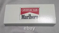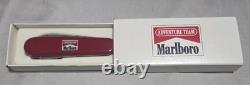 The Marlboro Adventure Team Victorinox Swiss Army Pocket Knife is a vintage collectible folding knife with multiple tools. Made with stainless steel blades and a plastic handle, this pocketknife features a corkscrew, screwdriver, and bottle opener. With a slipjoint lock type and ambidextrous dexterity, this original Swiss-made knife is perfect for collectors and outdoor enthusiasts looking for a versatile and compact tool.