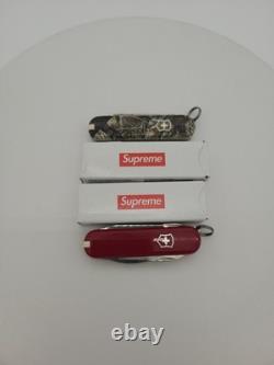 Supreme - Victorinox - Pocket Knife Victorinox - Red & True Timber Camouflage - SS25 Lot Of 2 New DS. Check out our other listings at LikeNewGizmo's store! The product is a set of two new Victorinox SS25 pocket knives in red and camouflage colors. These knives feature stainless steel blades with a drop point, pen, and spear point types. The manual opening mechanism and slipjoint lock type make them easy to use.
